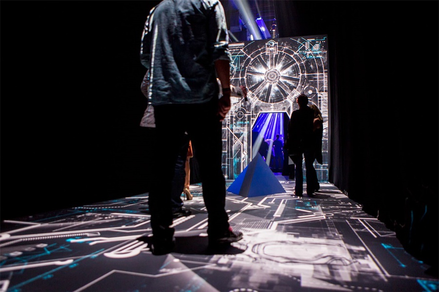 為了回答品牌整合的問(wèn)題,創(chuàng)建了三維互動(dòng)空間,通過(guò)紅外線指針,客人可以在墻壁和地板上看到與品牌相關(guān)的內(nèi)容,用紅外線來(lái)觸發(fā)實(shí)時(shí)音頻和視頻效果。在活動(dòng)區(qū)域安裝了與空間隨機(jī)互動(dòng)的設(shè)備,來(lái)享受發(fā)現(xiàn)的體驗(yàn),為游客提供了一個(gè)有趣的方式來(lái)參與奧克利的靈感分享和走進(jìn)品牌。