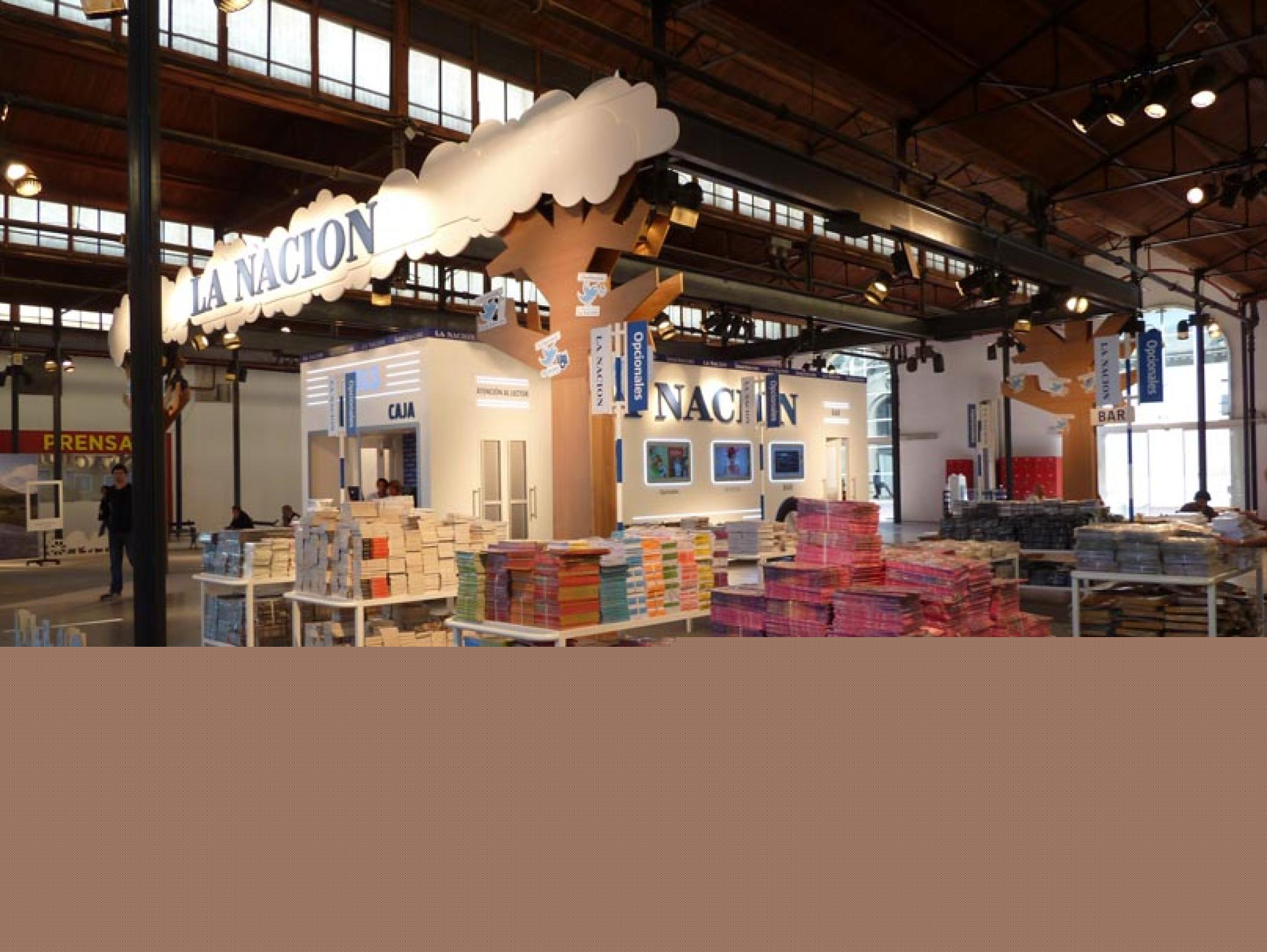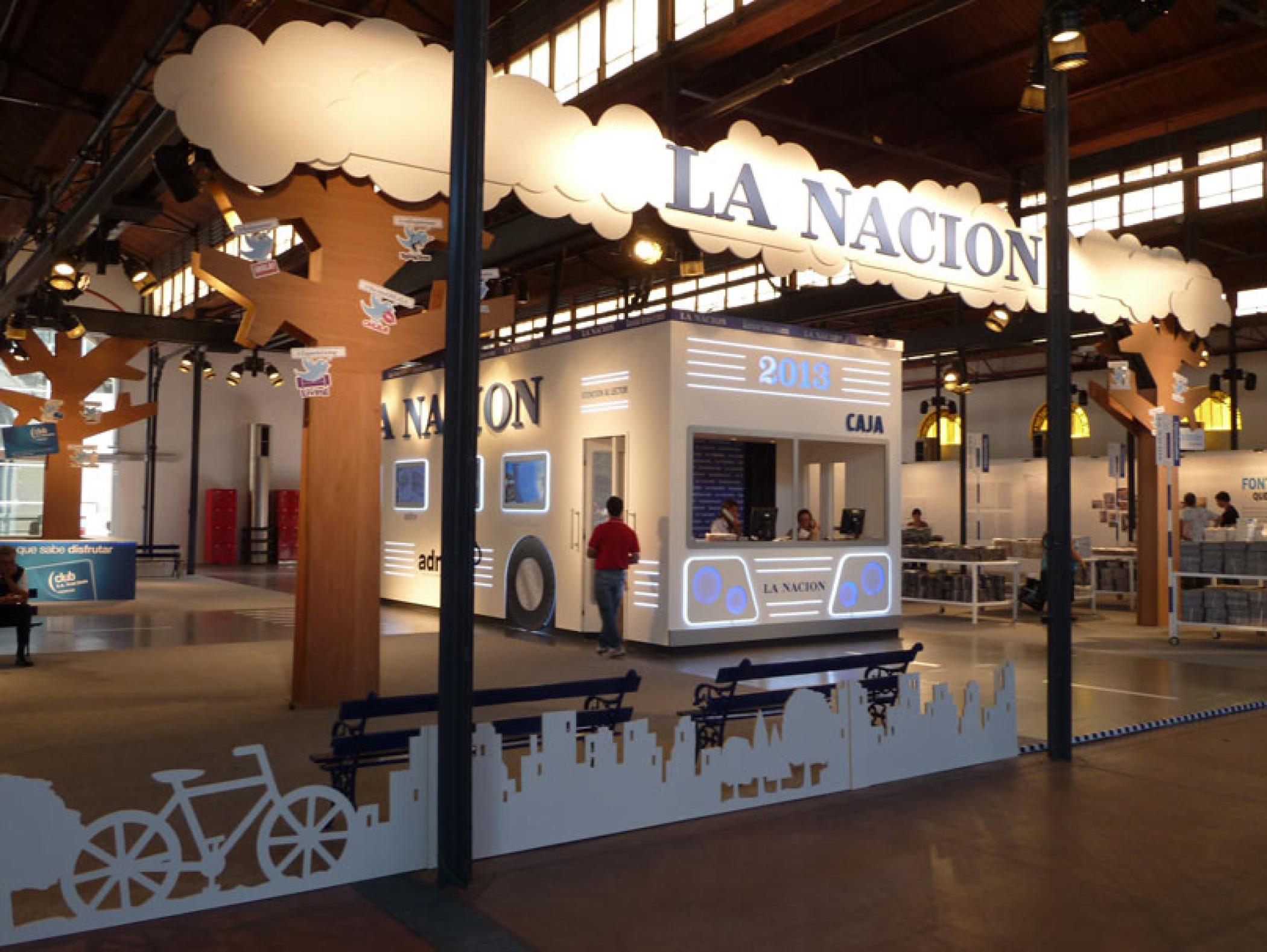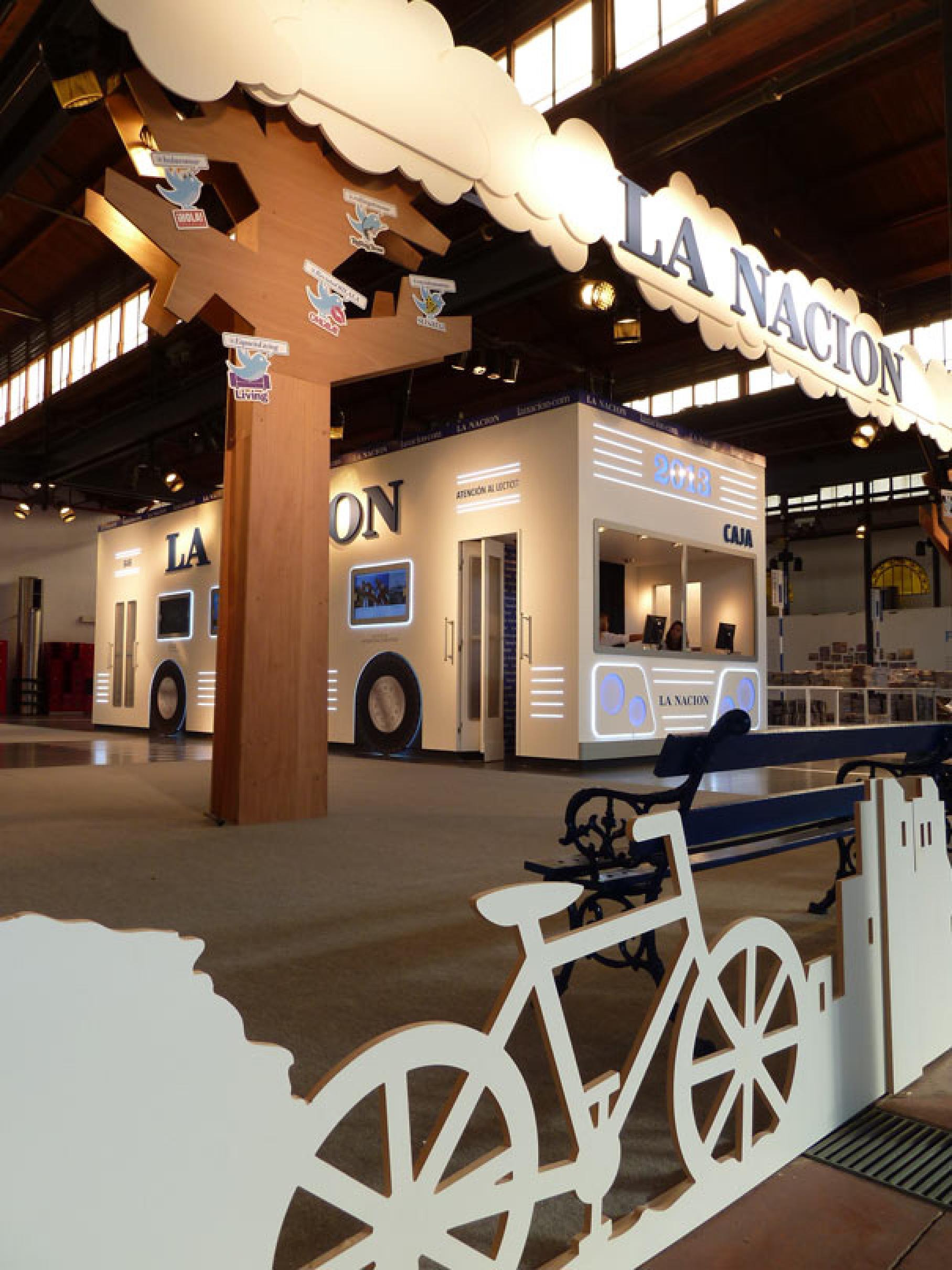 阿根廷書展《民族報(bào)》展覽活動(dòng)策劃現(xiàn)場(chǎng)提供了社區(qū)公園一樣的長(zhǎng)椅,客人可以坐在一個(gè)安靜的地方閱讀報(bào)紙和雜志。街道交匯處的中心是一個(gè)公共交通工具“巴士車”。巴士車的前部模擬了司機(jī)駕駛室,這里成為了客戶服務(wù)臺(tái)。而底部則是《民族報(bào)》酒吧的柜臺(tái)。車身的窗口被液晶顯示屏替代,不斷地播放該報(bào)紙的不同產(chǎn)品:雜志、電子報(bào)、Club LN、ADN 等。整個(gè)展示活動(dòng)空間的形式和色彩選擇了對(duì)綜合美學(xué)的追求,即營(yíng)造了城市環(huán)境也清楚地突出不同的《民族報(bào)》產(chǎn)品。大部分元素都是白色,這給空間帶來了特殊的亮度和廣度(寬敞感),突出了藍(lán)色的細(xì)節(jié),品牌顏色和樹木和桌子上木材色則給客人帶來了生活氣息與溫暖感。