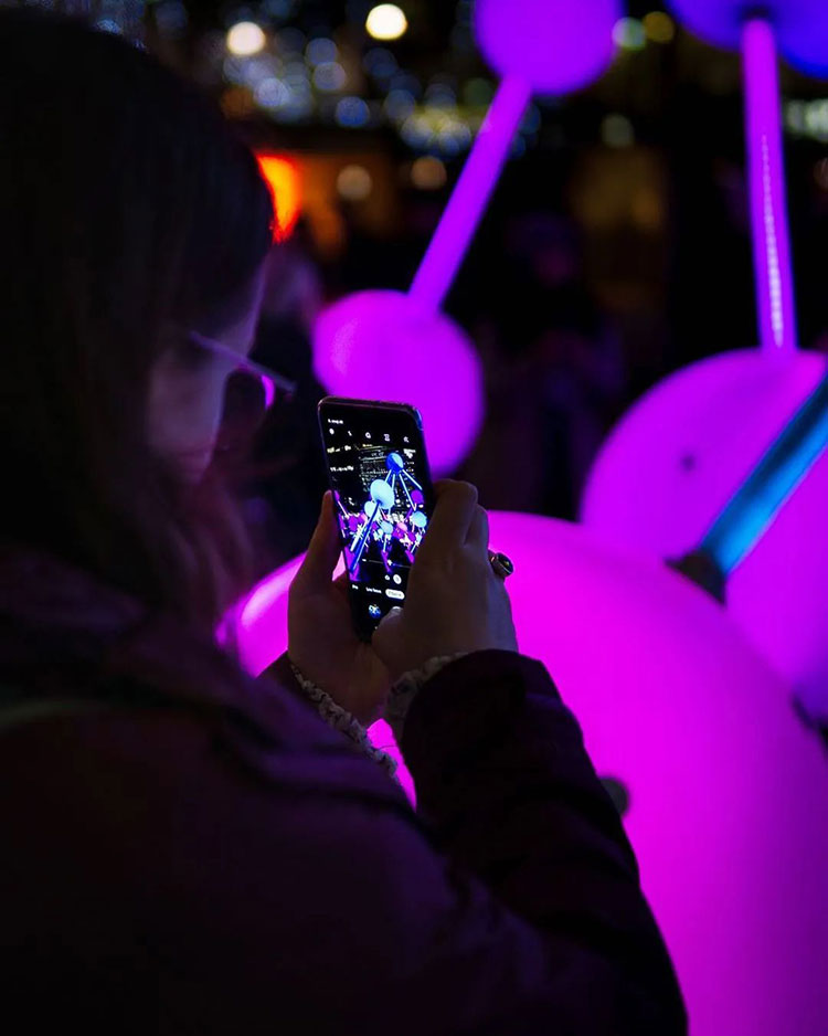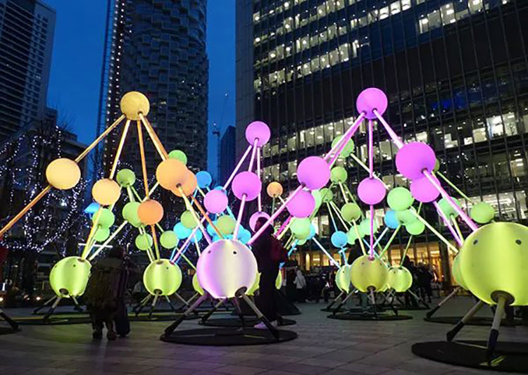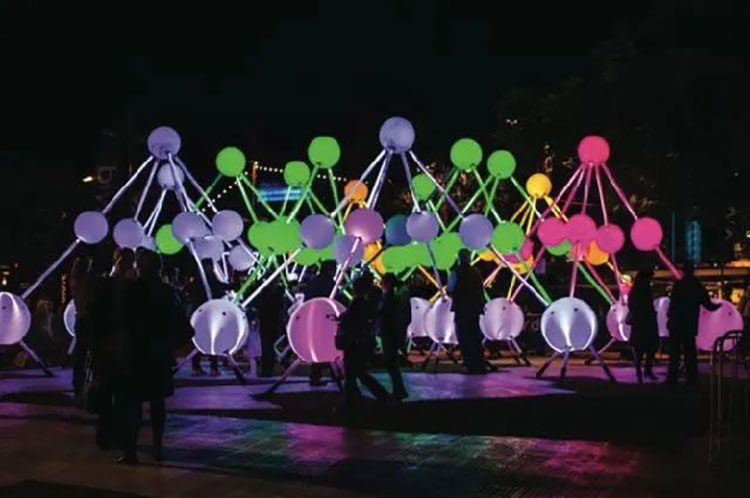 《Affinity》是Amigo&Amigo and S1T2設(shè)計(jì)的一件大型沉浸式的互動(dòng)燈光裝置,作品使用了過(guò)百的感應(yīng)器,多根數(shù)字霓虹燈管構(gòu)成五顏六色的相互連接的球形網(wǎng)絡(luò),可以發(fā)出超過(guò)50種不同的顏色,每個(gè)球體都相互關(guān)聯(lián),當(dāng)人們走進(jìn)作品區(qū)域中可以創(chuàng)造出一個(gè)獨(dú)特的沉浸式體驗(yàn),通過(guò)觸摸激活球體,五顏六色的光將不斷傳遞,觸摸的時(shí)間越長(zhǎng),光球的亮度越高,證明本體能量越大。