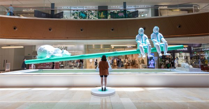 移步另一側(cè)展區(qū),引人注目的藝術(shù)裝置“蹺蹺板”為觀展增添了別樣驚喜。觀眾可通過特別設(shè)置的互動,使分別置于蹺蹺板兩端的“北極熊”和“人類”改變相對高度,寓意只要人類作出努力,就能幫助身處劣勢的珍稀動物轉(zhuǎn)危為機(jī)。富有想象力的互動吸引了不少市民親身參與,在方寸之地,探尋人與自然和諧共處的博大之道。