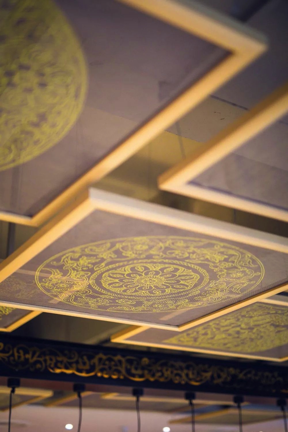 餐廳的內(nèi)部裝修,靈感源于唐朝詩(shī)人盧照鄰《元日述懷》“人歌小歲酒,花舞大唐春”,描述了家人在節(jié)日里團(tuán)聚一堂,設(shè)酒備宴的場(chǎng)景。選了黑灰、深朱紅、淺金色,三種源自古長(zhǎng)安盛唐建筑的色彩,勾勒出復(fù)古奢華又簡(jiǎn)潔現(xiàn)代的餐廳氛圍。盛唐時(shí)期的圖騰紋樣營(yíng)造空間感,與盛唐建筑形式相呼應(yīng),用現(xiàn)代的藝術(shù)美感呈現(xiàn)“花舞大唐春”元素,營(yíng)造出一種花團(tuán)錦簇的盛唐氛圍。餐廳的角角落落里,都可以看到各處墻壁上的金銀器紋樣。一樓和二樓的吊頂,用紗幔式的表現(xiàn)方式,唐代金銀器和瑰麗的花鳥(niǎo)紋樣在空中蔓延,讓顧客不經(jīng)意抬頭也能發(fā)現(xiàn)驚喜。來(lái)到這里用餐,就如同走進(jìn)盛唐夢(mèng)境,體驗(yàn)一場(chǎng)充滿藝術(shù)與靈感的極致盛宴。
