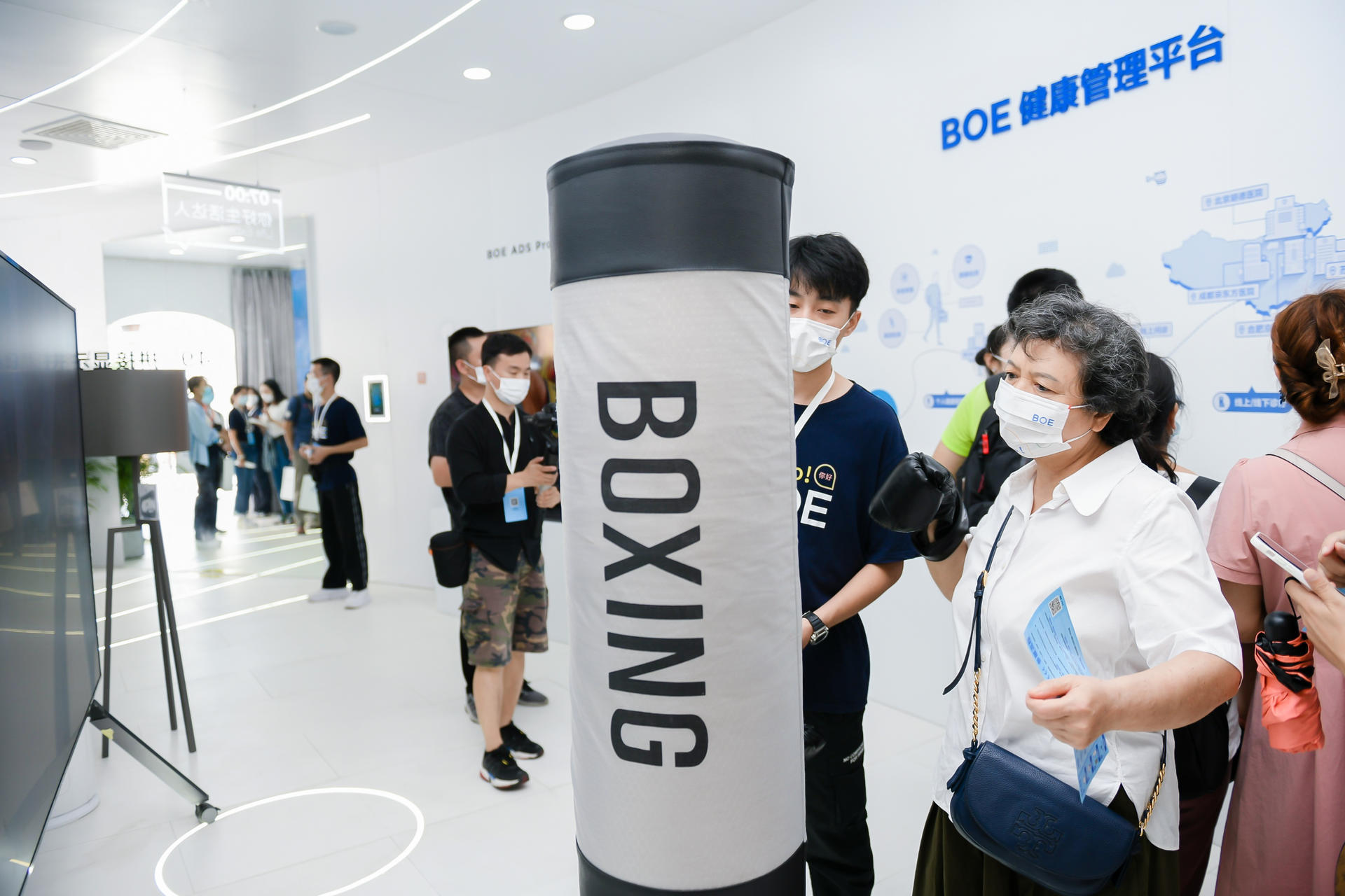 在智慧健康體驗(yàn)區(qū),通過(guò)參與傳感搏擊游戲,參觀者可實(shí)時(shí)在超高清大屏上獲取速度、力度等健康數(shù)據(jù),同時(shí)投影互動(dòng)墻還全面展示了BOE(京東方)基于個(gè)人健康管理、社區(qū)衛(wèi)生服務(wù)和數(shù)字醫(yī)院診療的全方位全周期健康管理平臺(tái)。