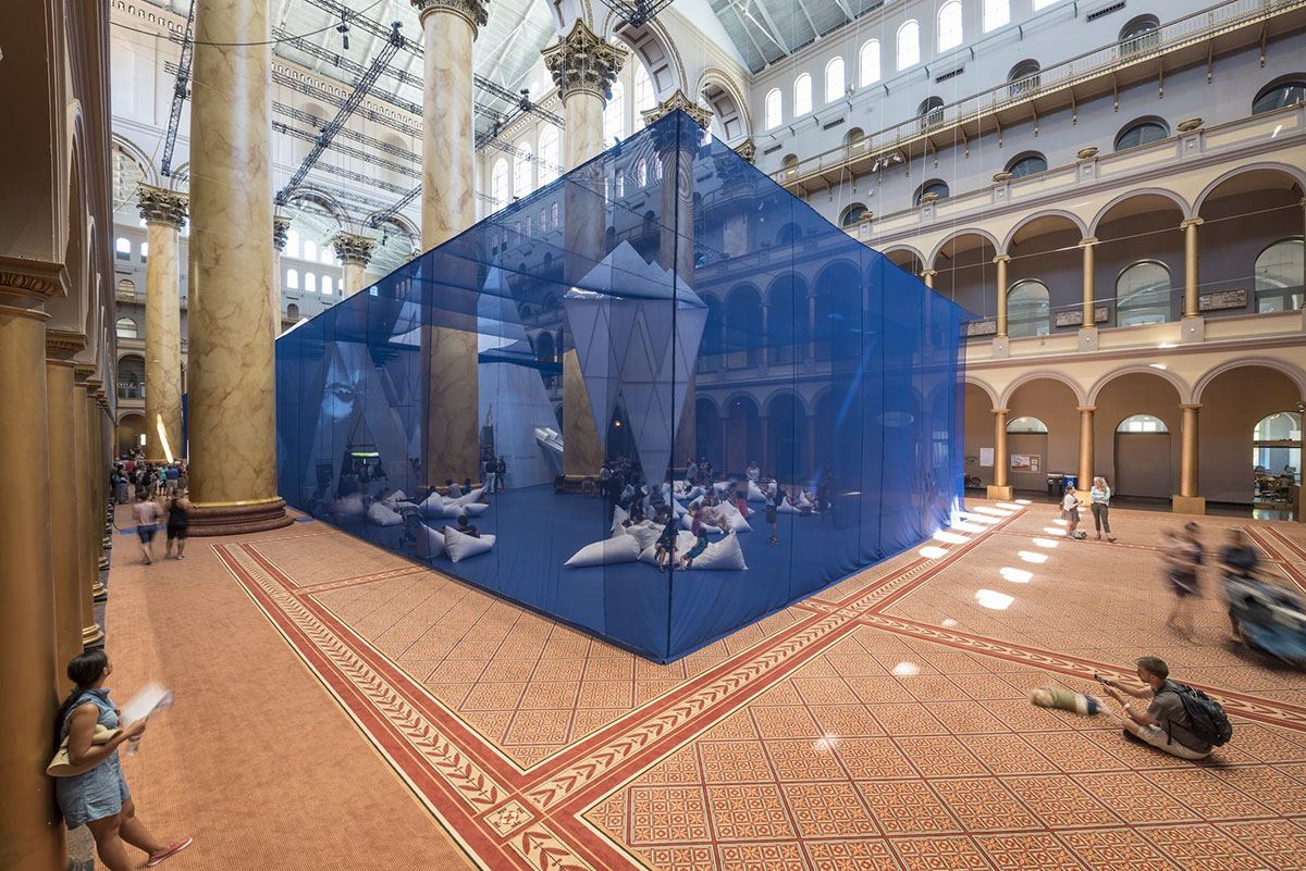 該裝置以各種不同尺寸的裝置元素為特色,由30多個(gè)半透明聚碳酸酯面板制成的棱柱形三角形五面體和八面體組成,高度從16英尺到56英尺不等,有些懸掛在天花板上,看起來像是漂浮著的,一個(gè)巨大的藍(lán)網(wǎng)將其他冰山碎片包裹在一個(gè)巨大的三角形外殼和天花板基準(zhǔn)框架內(nèi),地板上隨機(jī)散落分布著許多三角形的豆包坐墊。