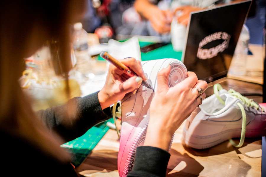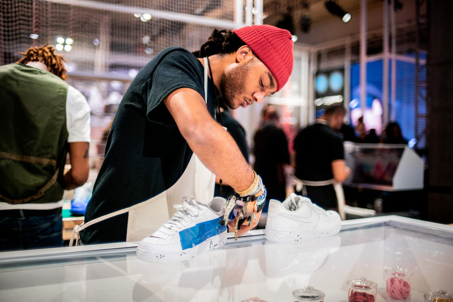 進(jìn)入會(huì)場(chǎng)中心,這是一個(gè)為消費(fèi)者和特殊客人定制和現(xiàn)場(chǎng)制作的區(qū)域。高中籃球隊(duì),NBA運(yùn)動(dòng)員和普通大眾可以在這里定制一雙鞋。定制區(qū)域?qū)γ媸钱a(chǎn)品展示和零售區(qū)域。