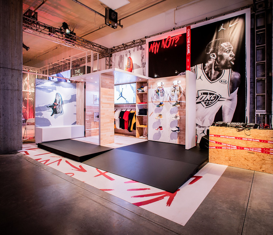 移動(dòng)到空間的后面是一個(gè)籃球場(chǎng),消費(fèi)者可以嘗試剛剛發(fā)布的Nike Adapt BB。在球場(chǎng)的右側(cè),產(chǎn)品專家?guī)椭M(fèi)者了解產(chǎn)品并確保正確使用。在球場(chǎng)的左側(cè),消費(fèi)者通過訓(xùn)練來感受鞋子。最終,消費(fèi)者也可以購(gòu)買產(chǎn)品。