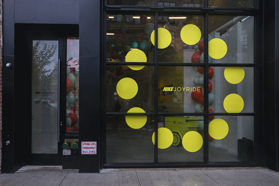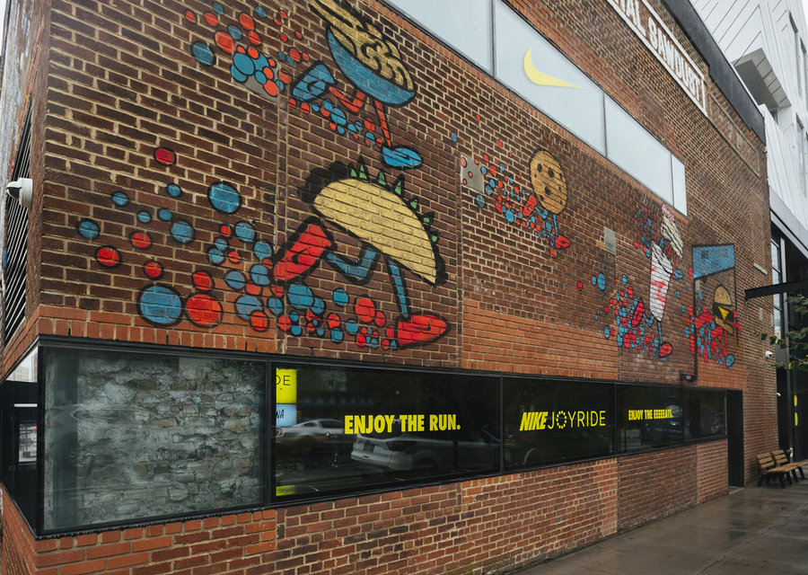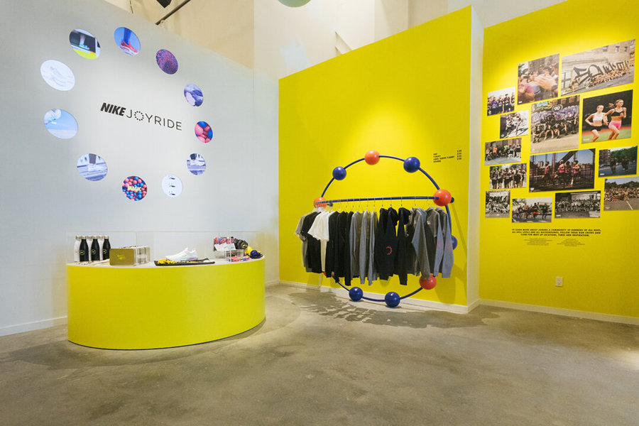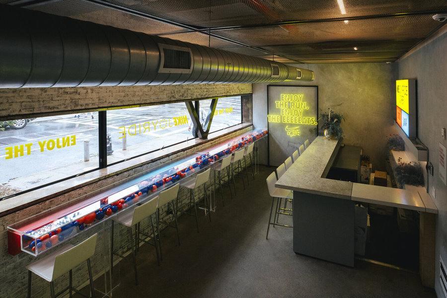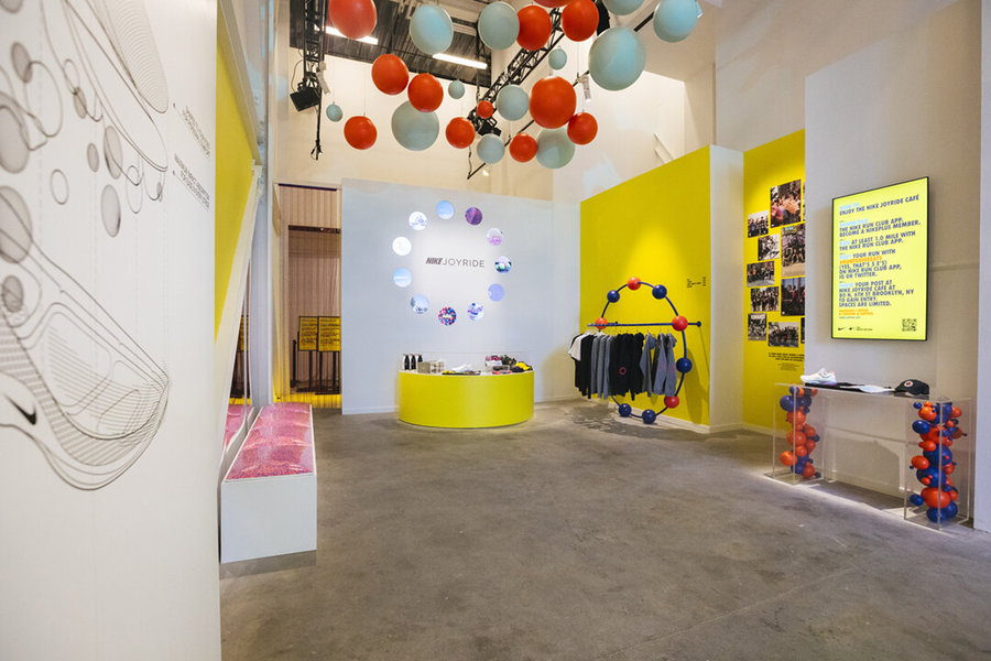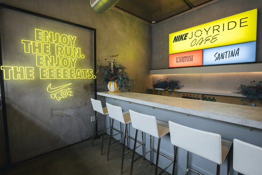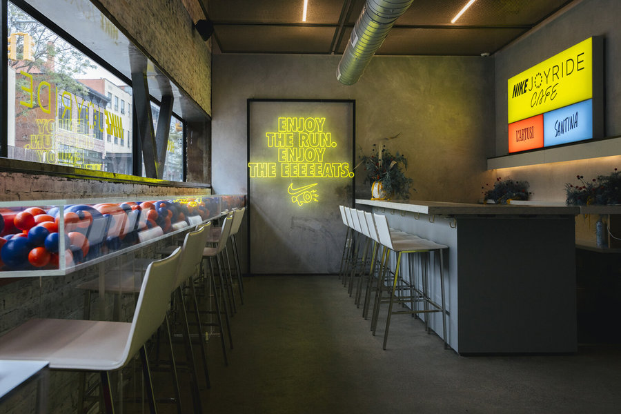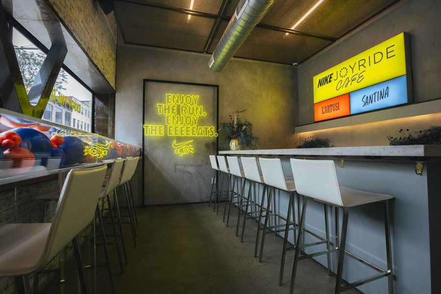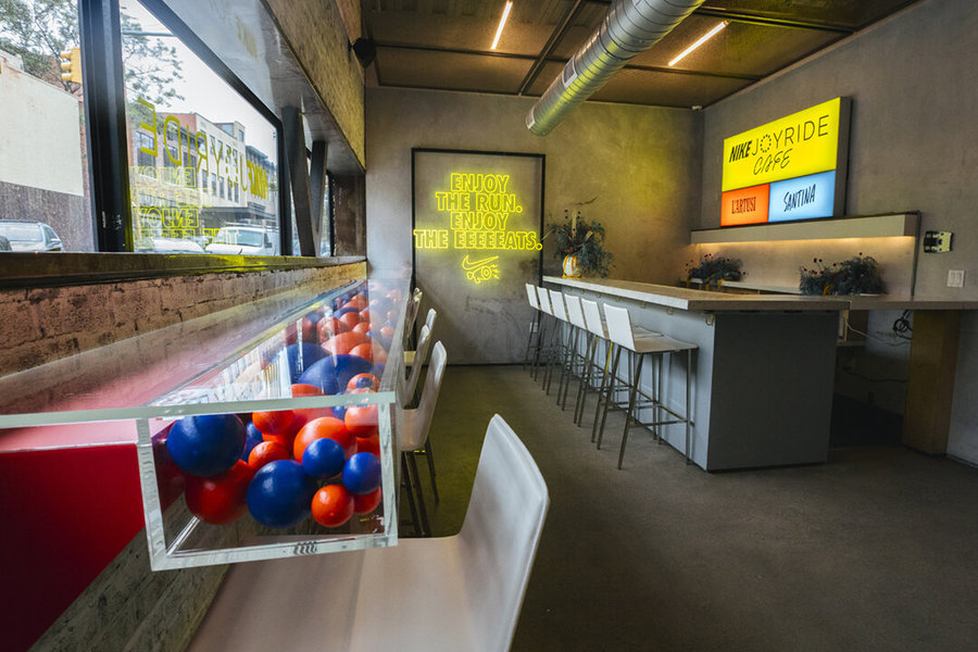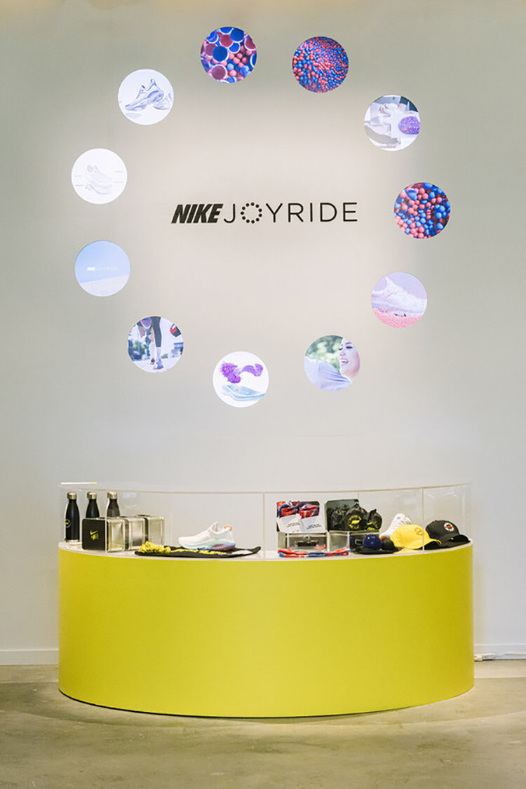 活動(dòng)執(zhí)行了一個(gè)為期三周的零售和餐飲活動(dòng),靈感來(lái)自耐克的最新創(chuàng)新:Joyride的珠狀鞋底。在耐克的“跑步俱樂(lè)部”(Run Club)應(yīng)用上跑了一英里后,客人就可以進(jìn)入Joyride的咖啡館,咖啡館里有可供選擇的旋轉(zhuǎn)主題盤子,并在透明的臺(tái)面坐下,臺(tái)面下是丙烯酸樹脂的泡沫球,暗示著新鞋底的創(chuàng)意設(shè)計(jì)。